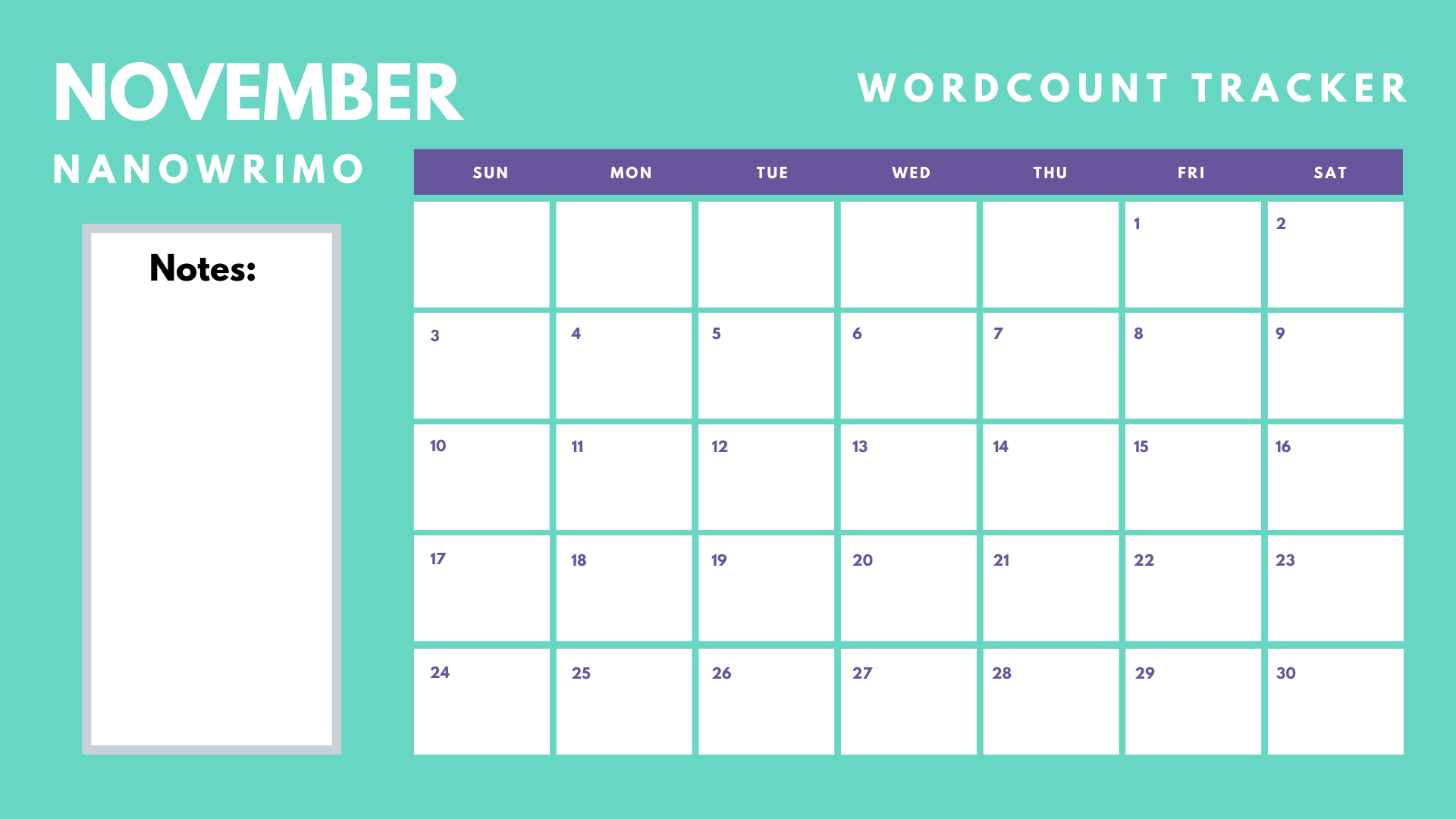 Download a NaNoWriMo Calendar by right clicking > Save Image As > Save to your computer below.