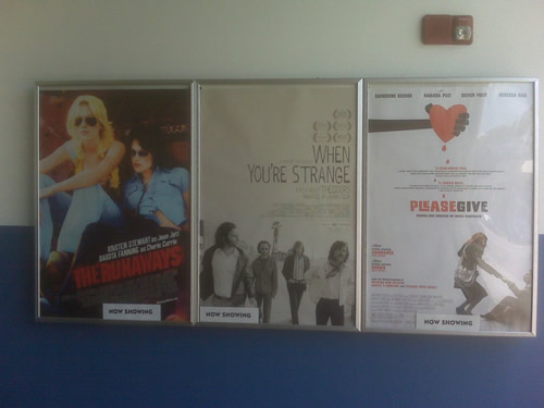 A big poster hung outside, and mini posters adorned the walls near the bar. There was a bar in the lobby, they even had plush blue couches that reminded me of hotel lobby furniture in the places where my family used to take vacations when I was a kid. After having a drink at the bar, I went to get my ticket. One guy next to me asked for 2 tickets to the other film playing, but the cashier misunderstood him and asked, “Two for ‘When You’re Strange’?” He said no, 2 tickets to the other film. Then he tilted his head and said, “I didn’t think there were other films showing during this time slot. What’s WYS about?”